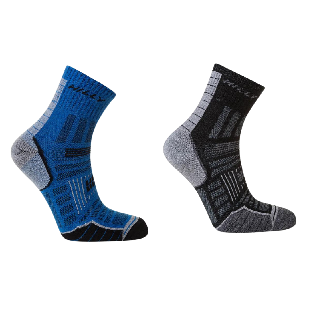 The fine inner sock is made from Meryl®, which draws moisture away from the foot and transfers it to the outer sock. The dri-release® outer layer is great at drying to leave your feet feeling dry and comfortable. This double-layer construction prevents friction from occurring on your feet and blisters from appearing. The durable heel and toe sections help you put the miles in, making Twin Skin® a trusted partner of many runners. The LYCRA® SPORT fibre ensures a close, comfortable fit. Available in a variety of colours and also in a socklet length. Socks designed and manufactured by HILLY, the UK's premier technical performance sock company for runners, founded by Ron Hill.