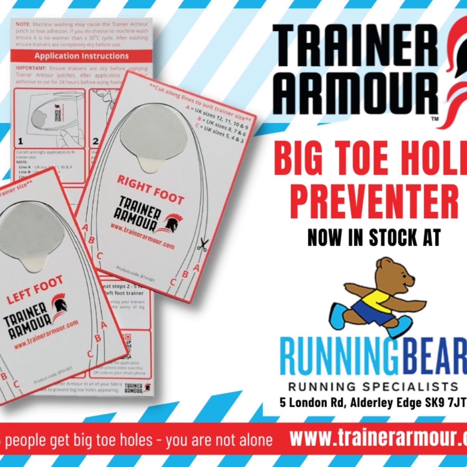 Don’t replace expensive trainers due to big toe holes, fit Trainer Armour in new trainers to prevent the holes appearing. At Running Bear we want your shoes to last the full 500 miles/year so this is the best way to get longevity out of them!